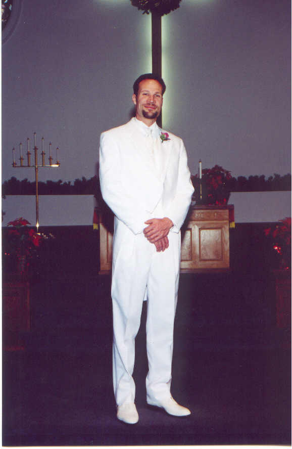 This is me, the Groom, pretty much in a dreamworld here. Actually, I still am. As I mentioned at the wedding, there were several reasons I chose to wear a white tux, not the least of which was to convey the fact that I am clean and forgiven of all sins, washed white as snow. I also wanted to show my union with Karrie. But a very important reason I wore a white tux is so that my dandruff would not be so obvious.